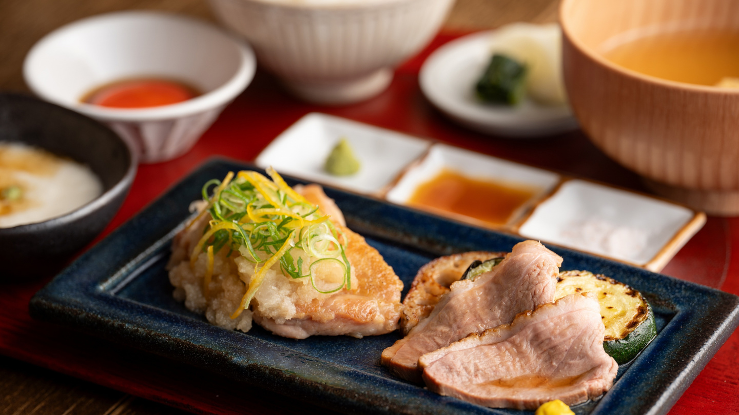 Grilled ”KYOAKA Jidori” chicken thighs with grated daikon ponzu sauce and “Kyogamo” duck loin set menu meal